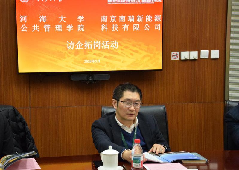 为深入贯彻落实国家关于高校毕业生就业工作的决策部署,深化校企合作、协同育人,拓宽学院实习实践资源,畅通毕业生就业渠道,精准对接企业多元人才需求,2026年3月6日,河海大学公共管理学院党委书记吴宝海、副书记朱志梅、团委书记任丽雪、副书记强文丽、辅导员方婕一行赴南京南瑞新能源科技有限公司,开展访企拓岗专项调研交流。在公司党委书记石磊及相关负责人的陪同下,实地参观了企业,近距离了解企业发展运营情况。