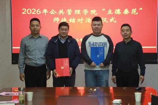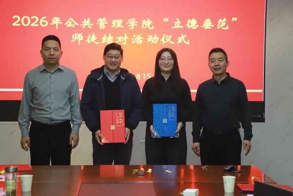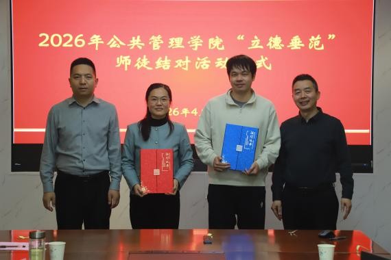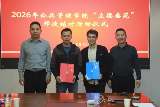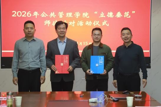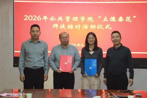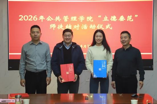 2026年4月15日下午,公共管理学院立德垂范师徒结对仪式在厚学楼401室举行。学院党委书记吴宝海、院长朱新华与新结对师徒参加了活动。仪式由吴宝海书记主持。